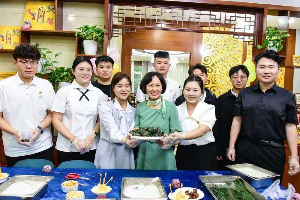 座谈交流环节,毕业生代表分享大学生活与成长感悟。少数民族毕业生代表张乐向与会领导、老师敬献哈达。恰逢端午,活动融入传统文化元素,师生互赠五彩绳、香囊,传递平安健康与驱邪纳福的美好祝愿。随后,师生共同包粽子,折粽叶、填糯米、系棉线,在欢声笑语中完成一个个饱满的粽子。